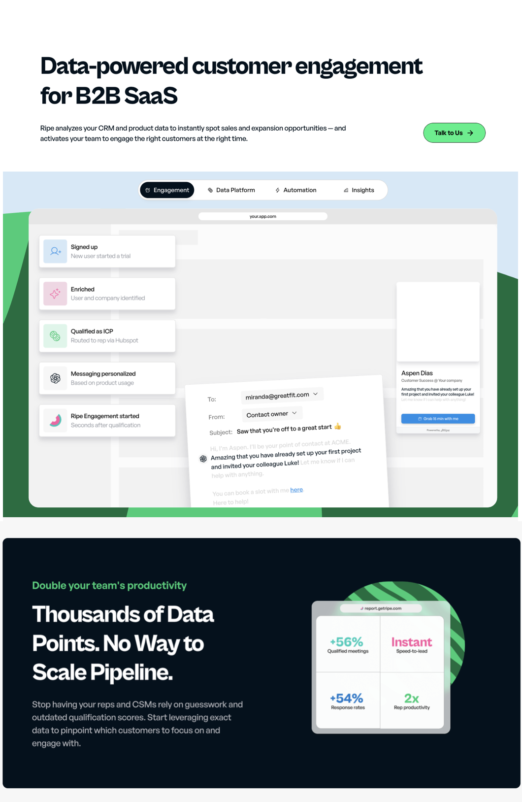 Ripe was a pre-seed go-to-market SaaS with a powerful but complex product. They analysed product and CRM data to help Sales and Marketing teams at PLG companies identify which users were most likely to buy – and engage them at the right moment.