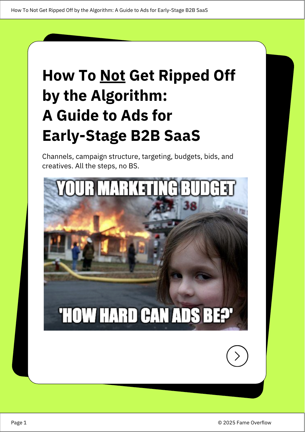 21 pages where I spill all my secrets frameworks. What doesn't work and why, how to stand out, examples, and process to follow. Read this to stop wasting money on forgettable campaigns.